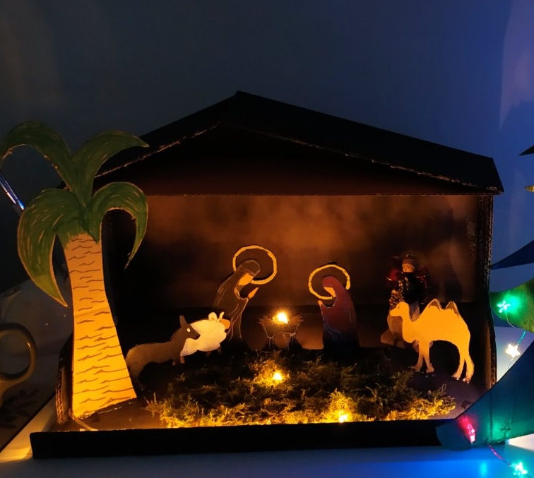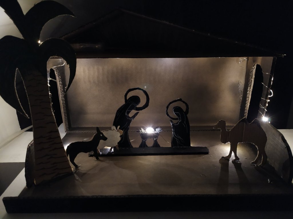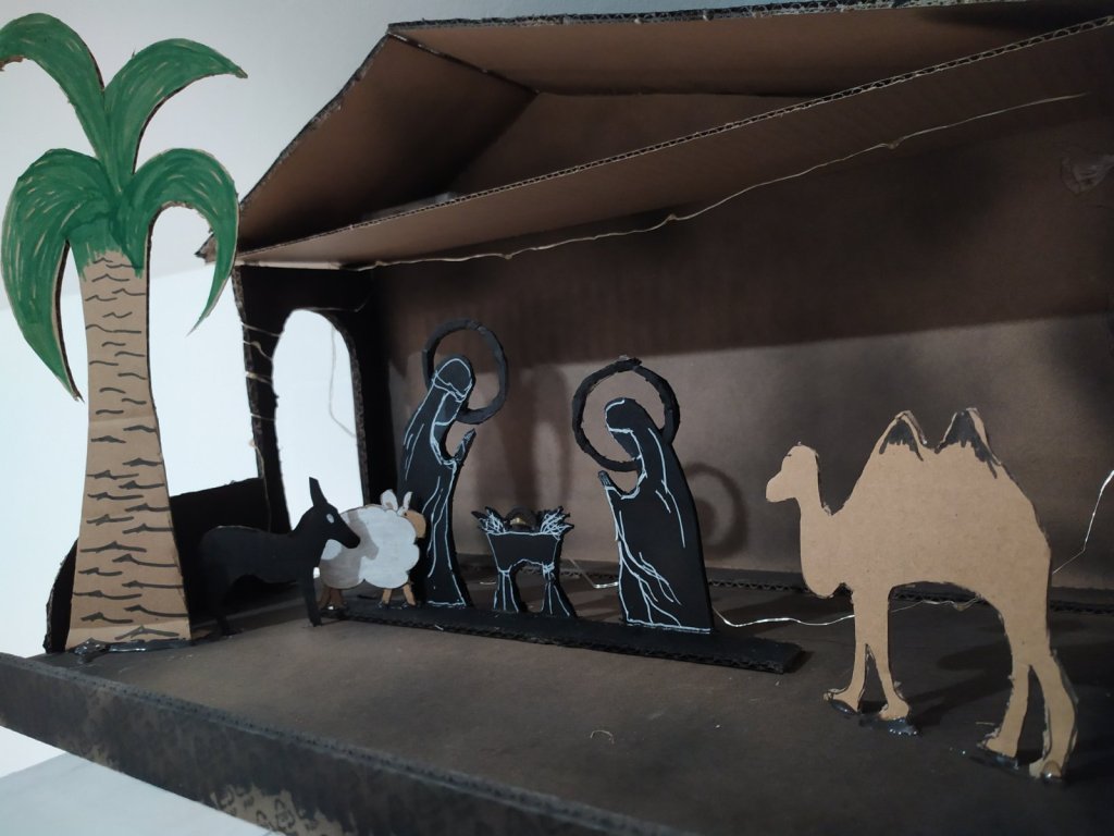 A Betlehemet teljesen saját kútfőből találtam ki, így ahhoz nem tudok sablont vagy leírást adni. A pálmafát, az emberek és az állatok alakjait úgy rögzítettem, hogy alul hagytam egy visszahajtható kis fület, amivel az istálló talapzatára lehet őket ragasztani. A jászolba egy vékony dróton lévő ledsor egyik kis lámpája került Jézus fényeként, az aljzatra pedig megszárított mohát ragasztottam. Az alakokat fehér illetve zöld és fekete filccel festettem meg, illetve a nagyobb fekete részekhez fekete festékspray-t használtam.