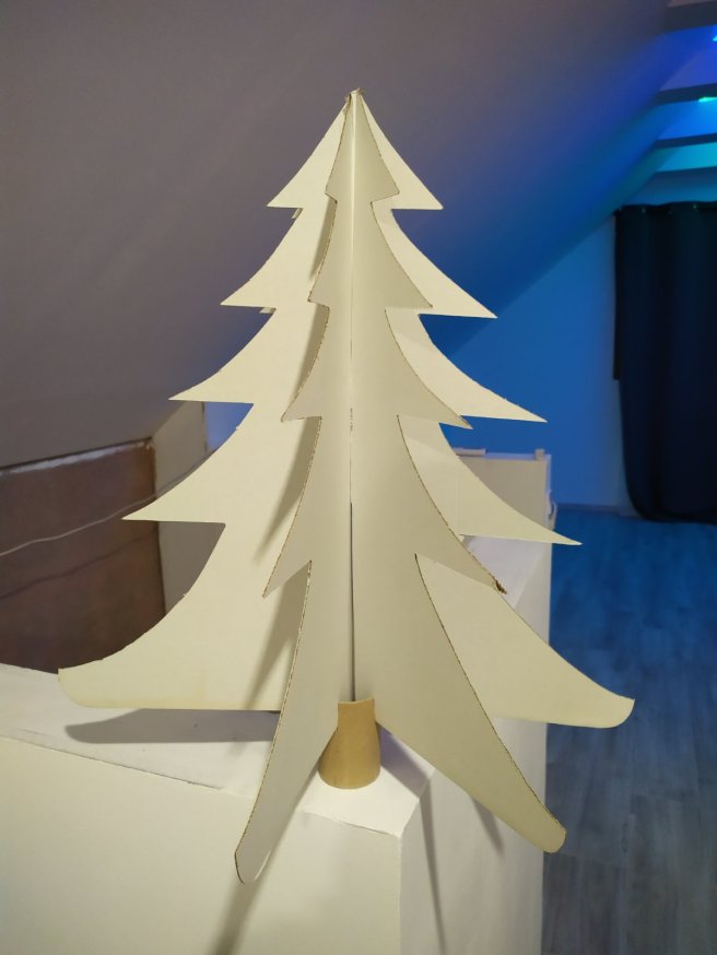 A karácsonyfa/fenyő alakja és mérete tetszólegesen megrajzolható. Ezt az alakot 3-szor kell megrajzolni, majd kivágni. Az egyiket középen a fenyő csúcsától lefelé kell bevágni, nagyjából a közepéig. A másik két alakot alulról felfelé kell bemetszeni, szintén addig, amíg az elsőt vágtuk be. A fenyő alja padkófóliából megmaradt papírguriga lett. Ez is tetszőleges méretű lehet. A biztosabb tartás miatt a papírgurigát bevagdostam félig azokon a pontokon, ahol a fenyő egy-egy oldala illeszkedik rá, és ebbe “ültettem” bele.